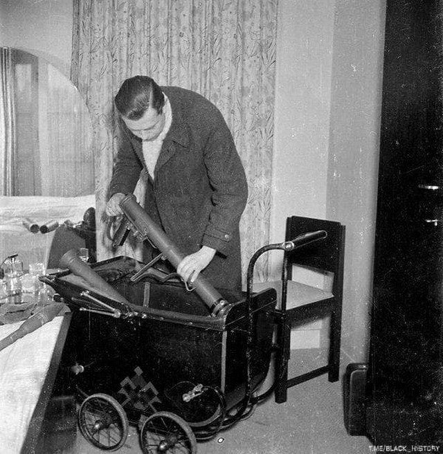 Боец сопротивления прячет минометы в детскую коляску. Амстердам, 1945 год.