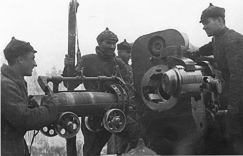 Процесс заряжания 203мм снаряда в тяжёлую гаубицу 5-4. Февраль 1940г.Из-за большой разрушительной силы, позволявшей уничтожать толстостенные DOTы, финны называли гаубицу «Сталинской Кувалдой».