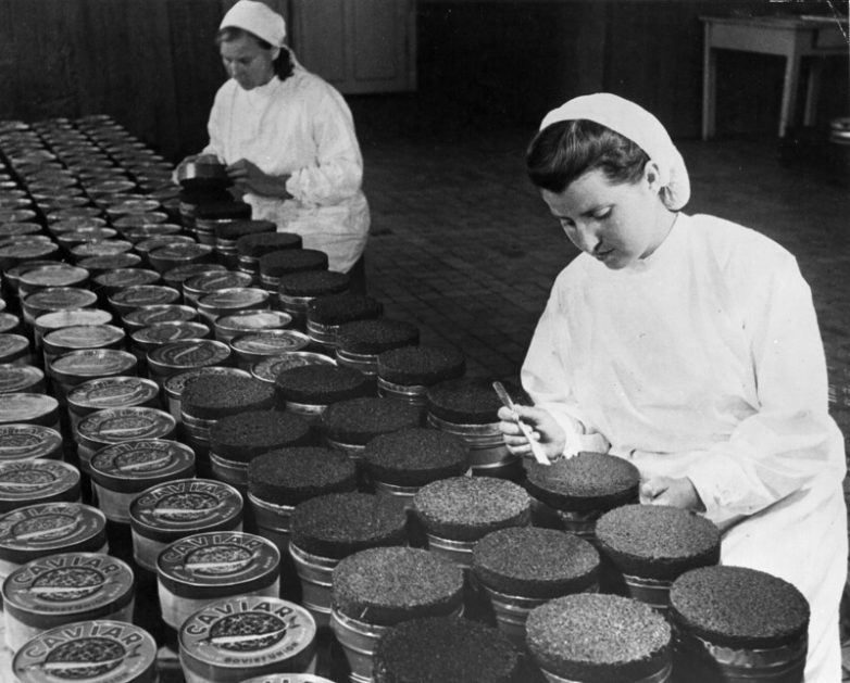 Ҡонтролеры А. Андреева и М. Мысова проверяют качество икры перед упаковкой на экспорт. Отделение Кировского рыбного хозяйства в Азербайджане, 1947 год