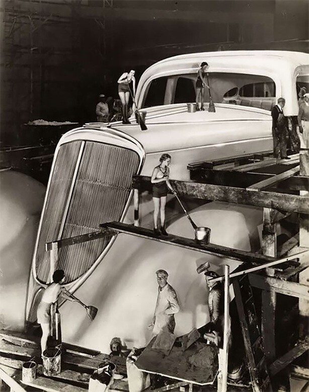 Процесс изготовления гипсовой копии президентского Studebaker для выставки Chicago &xpo 1933-1934. Выставочный был увеличен по сравнению с оригиналом в шесть раз, около 24 метров в длину, ширина и высота достигли 9 и 8,5 метров. В макете был оборудован лекционный зал на 80 человек.