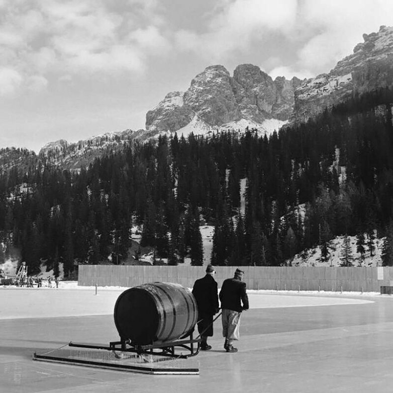 Гладкую поверхность катка формируют с помощью хайтек-устройства с бочкой. VII зимние Олимпийские игры. Кортина-д«Ампеццо, Италия, 1956 г.