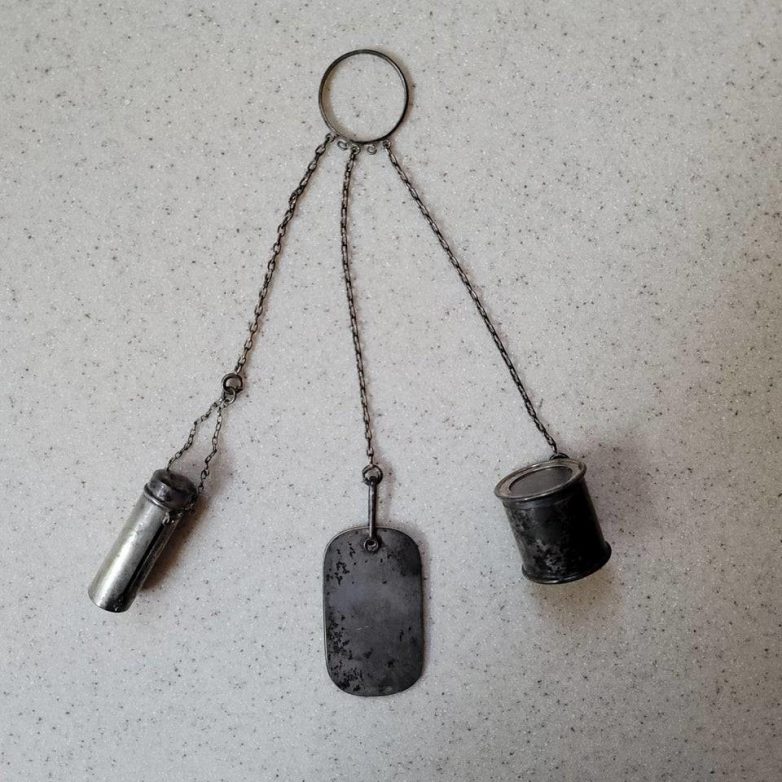 Ответ: «Это шатлен — изделие, к которому крепятся различные предметы, необходимые в быту. В данном случае: старая помада, маленький блокнотик и монетница»
