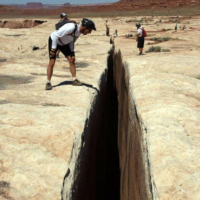 «Чёрная трещина» в национальном парке Каньонлендс, ЮТА, США. Естественный раскол шириной в метр и с достаточной глубиной, чтобы провалившийся в неё не выжил.