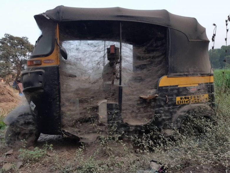 Паутина целиком закрывает брошенный автомобильчик рикши