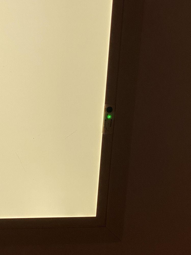 Ответ: «Это индикатор, показывающий, что у потолочной лампы есть резервный аккумулятор на случай чрезвычайной ситуации, и что он полностью заряжен.»