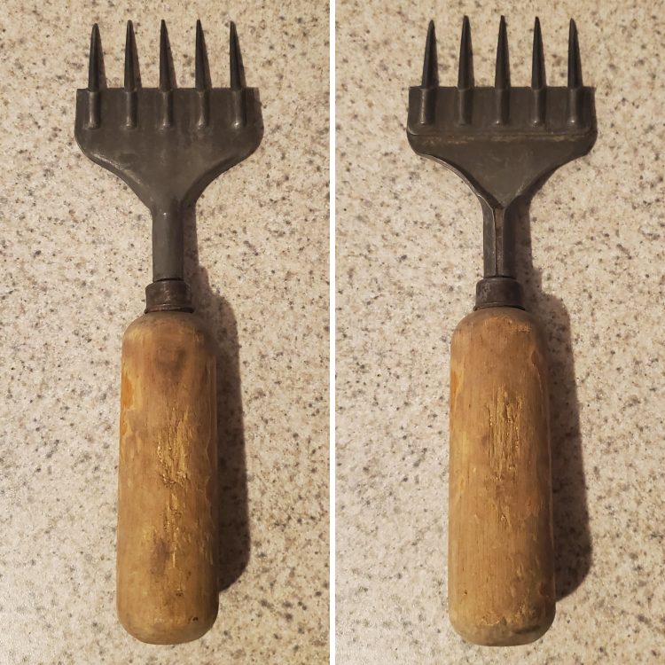 Вопрос: «У этой штуки есть деревянная ручка и металлический верх с 5 острыми зубцами. Около 22 см в длину. Была найдена среди кучи старинной кухонной утвари. Что это?»