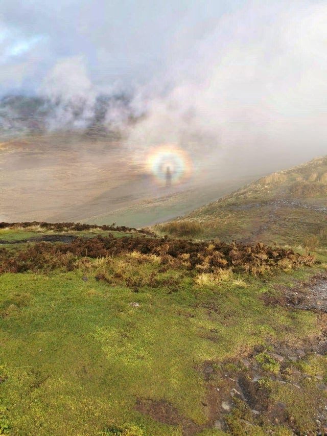 Это брокенский призрак — явление в горах, когда тень человека отражается в облаках или тумане