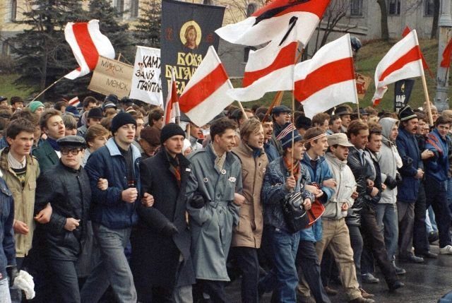 Беларусы протестуют на площади Якуба Коласа в Минске, 8 ноября 1990 года, в знак протеста против официального военного парада, посвященного 73-й годовщине революции