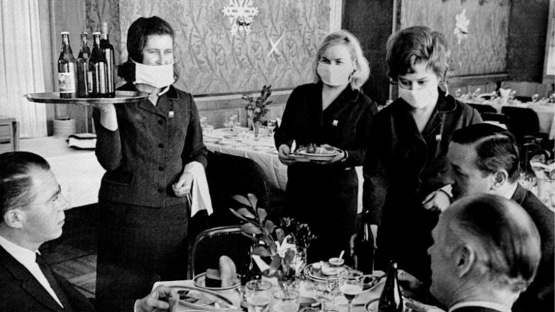 Ресторан гостиницы «Националь», Москва, 1969 год. Официантки в масках, т.к. в мире и в СССР тогда бушевала пандемия «гонконгского» гриппа.