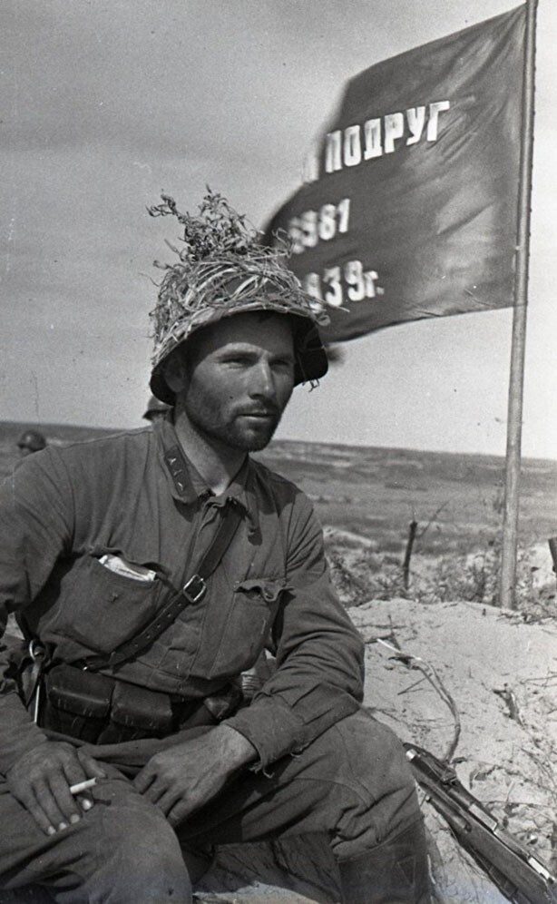Советский солдат у знамени «От боевых подруг», в самом конце военного конфликта у реки Халхин–Гол