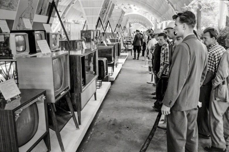 Москвичи рассматривают ассортимент советских телевизоров и радиоприемников представленных на временной выставке в Сокольниках, проходящей одновременно рядом с Американской национальной выставкой, Москва, 1959 год