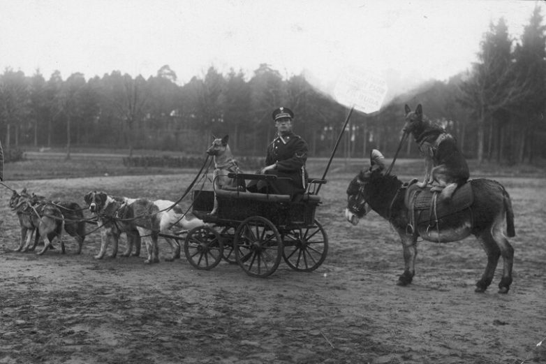 Немецкая собака-связной перепрыгивает окоп во время тренировки, май 1917 г.