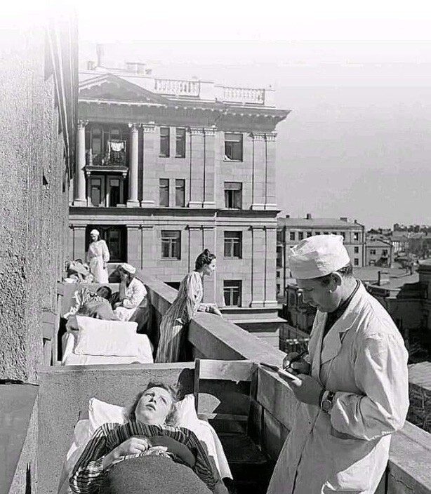 Пациенты Государственного центрального института курортологии на Новинском бульваре принимают воздушные ванны, Москва, 1951 год