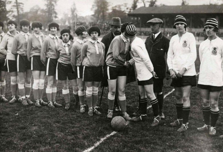Капитаны женских сборных по футболу Англии и Франции приветствуют друг друга перед началом матча, Лондон, 1925 г.