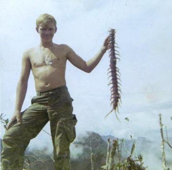 Солдат держит в руках вьетнамскую сколопендру. Вьетнамская война, 1967 год.