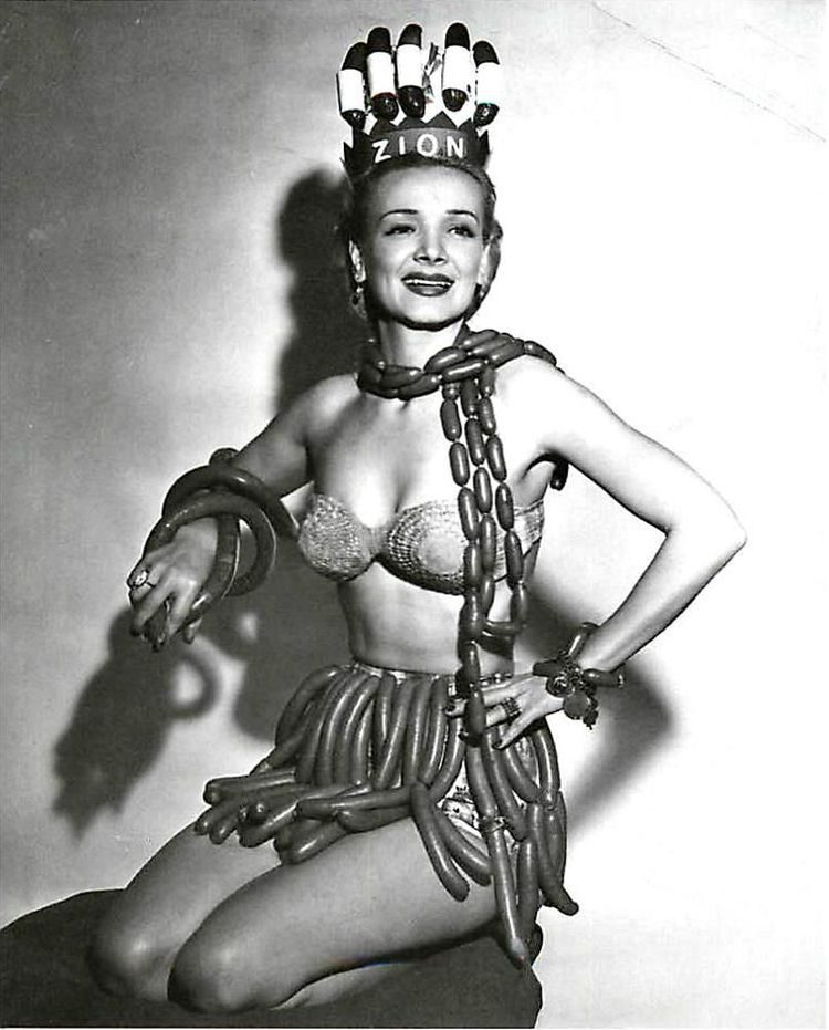 Джин Куртни, ставшая «Королевой сосисок» на конкурсе, проводимом компанией по изготовления мясных продуктов во время Национальной недели хот-догов, 1955 год