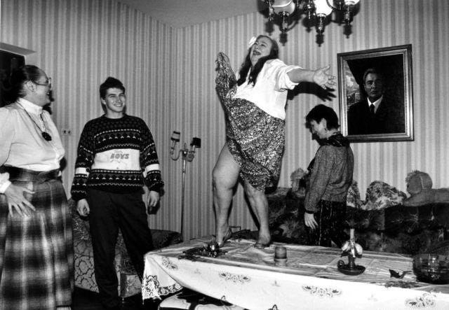 Дочь «вождя СССР» Леонида Брежнева Галина танцует на столе во время одного из праздников у себя дома, начало 1990-х