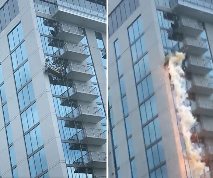Кабель машины для мойки окон порвался и задел линию электропередачи, вызвав короткое замыкание. Рабочих спасли страховочные ремни