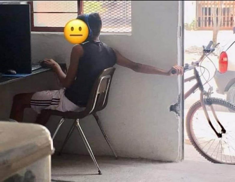 Одной рукой играет, а второй велик держит, чтобы не сперли