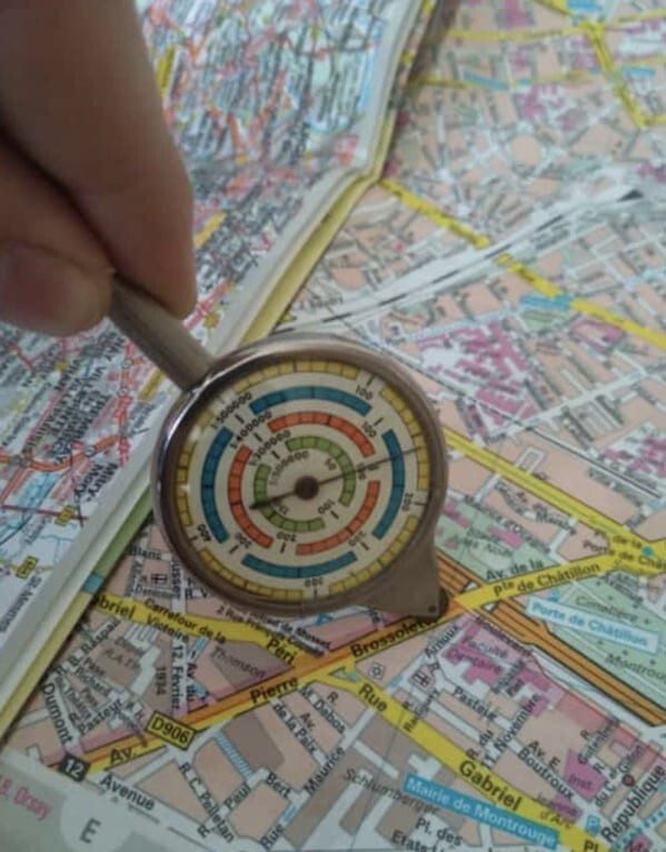Это курвиметр — прибор для измерения расстояния на карте. Катите его по нужным улицам — и н отсчитывает метры и километры