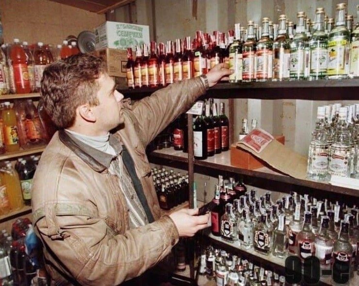 Налоговый инспектор проверяет алкоголь в небольшом магазинчике на подлинность. Москва, 1998 год