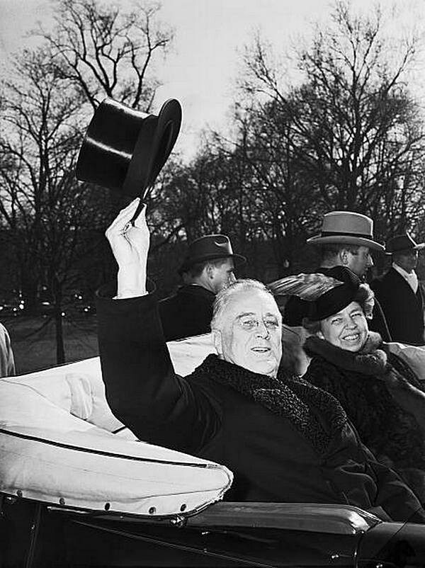 Президент Франклин Делано Рузвельт и Элеонора Рузвельт возвращаются в Белый дом из Капитолия после третьей инаугурации президента.