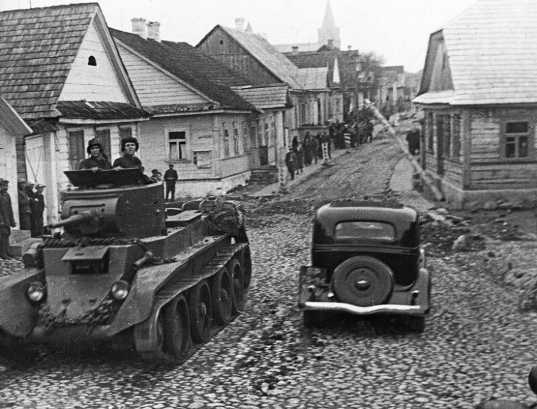 Советский танк на улице местечка Ракув (Raków, с 1921 по сентябрь 1939 в составе Виленского воеводства Польши) во время польского похода РККА. Польша. Сентябрь 1939 г.