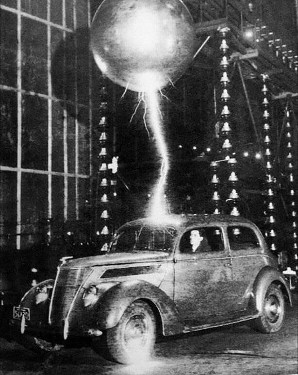 Автомобиль тестируют на устойчивость к удару молнии, подавая разряд в 3 млн. вольт, 1942 год