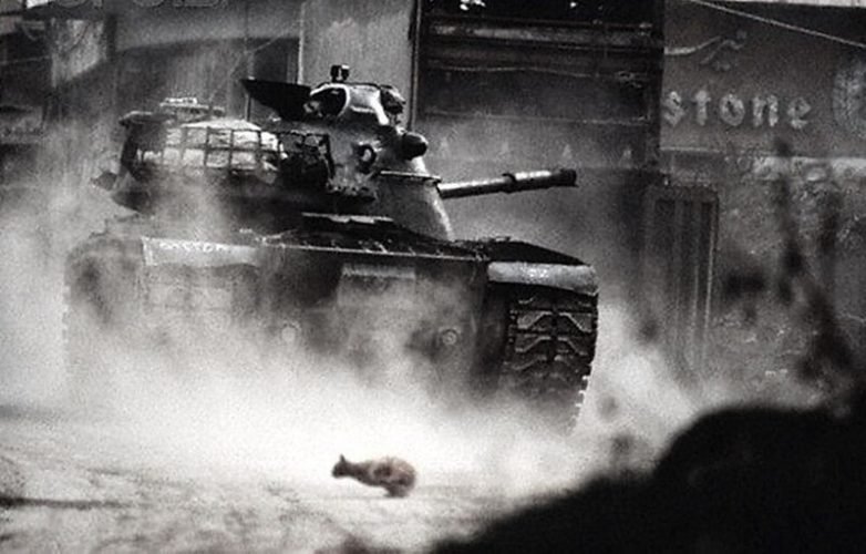 Кот перебегает через улицу во время уличного боя в Бейруте, Ливан, 1980-е