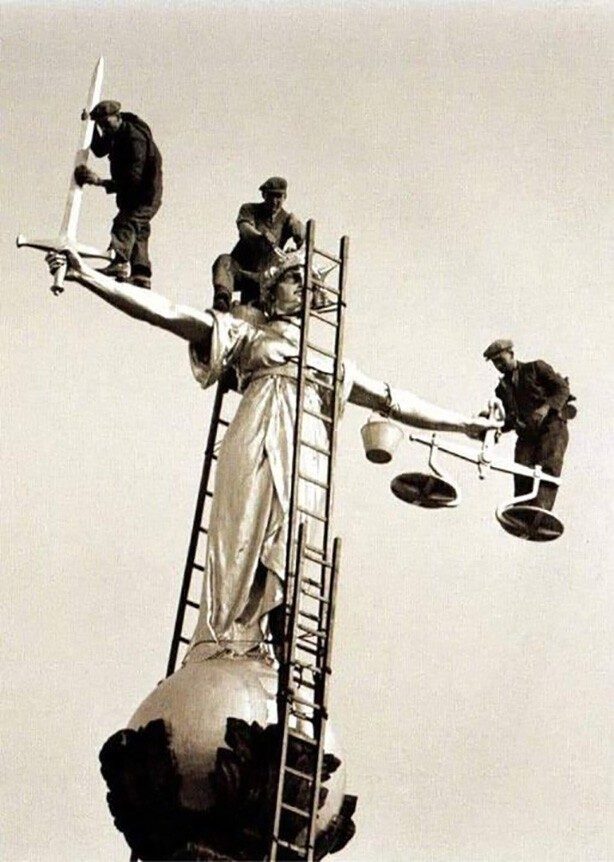 Очистка статуи Юстиции (Фемиды) на здании суда Олд Бейли, Лондон, 1933 год
