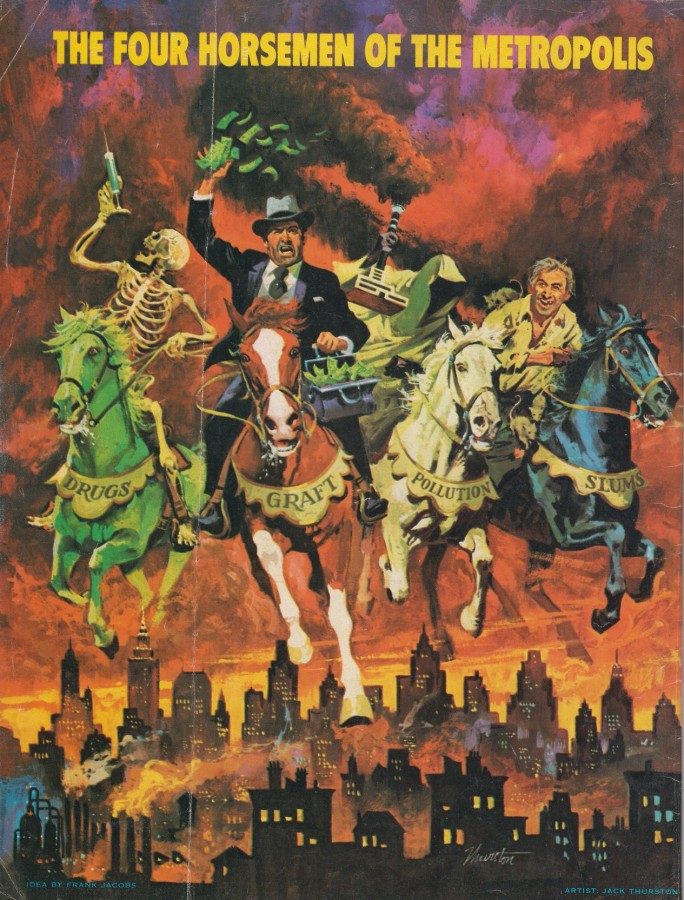 Октябрь 1971 года. Задняя обложка американского журнала Mad. Всадники «Наркотики», «Коррупция», «Загрязнение окружающей среды», «Трущобы».