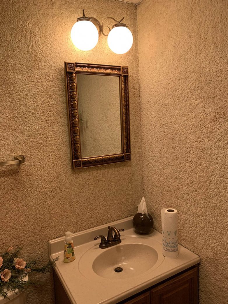Мы уже видели ванные комнаты с ковролином на полу, но с ковролином на стенах – впервые