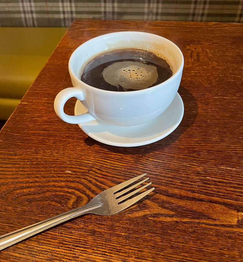 “Официантка только что принесла маленькую вилочку вместе с чашкой кофе”