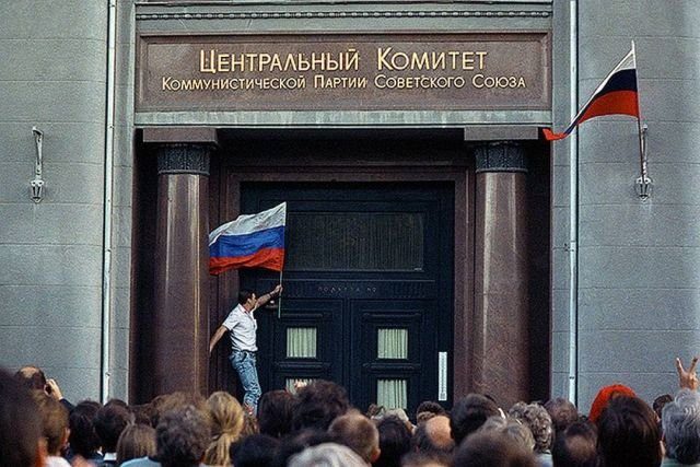 Митинг у опечатанного здания ЦК КПСС и МГК КПСС после провала путча 23 августа 1991 год.