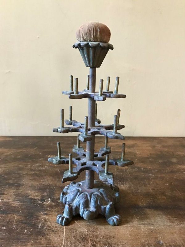 Такой чугунной штукой пользовались викторианские швеи, чтобы хранить нитки и втыкать в подушечку иголки. Катушки свободно вращались на шпульках, и их не надо было снимать, перед тем как отрезать необходимую длину