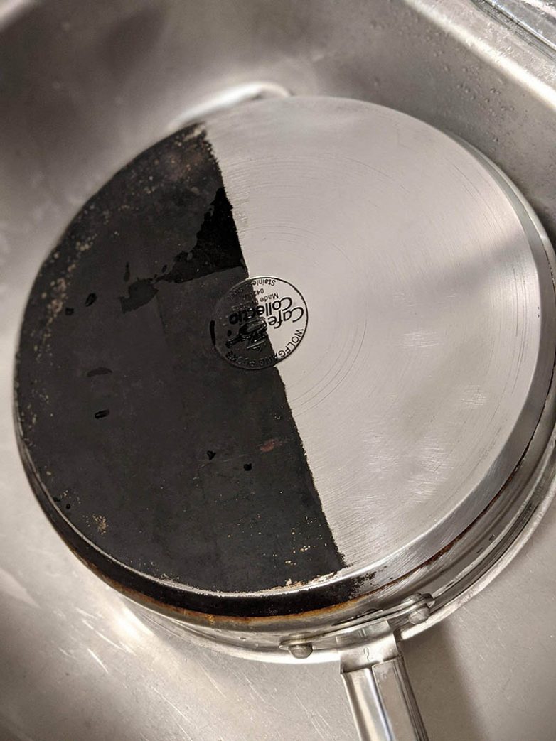 Идет процесс тщательной очистки сковороды, которой пользуются уже много-много лет