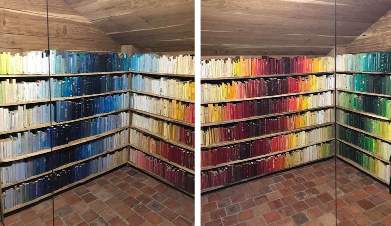 Книги отсортированы по цвету. Выглядит, как какой-то арт-объект. Кто-то скажет, что библиотека эта для красоты и книги тут не читают, но нет, ничего не мешает взять книгу и положить её обратно на то же место.