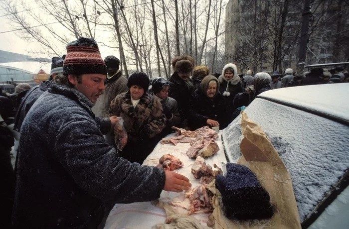 Предновогодняя торговля на багажнике своего авто. Россия, 1991 год.