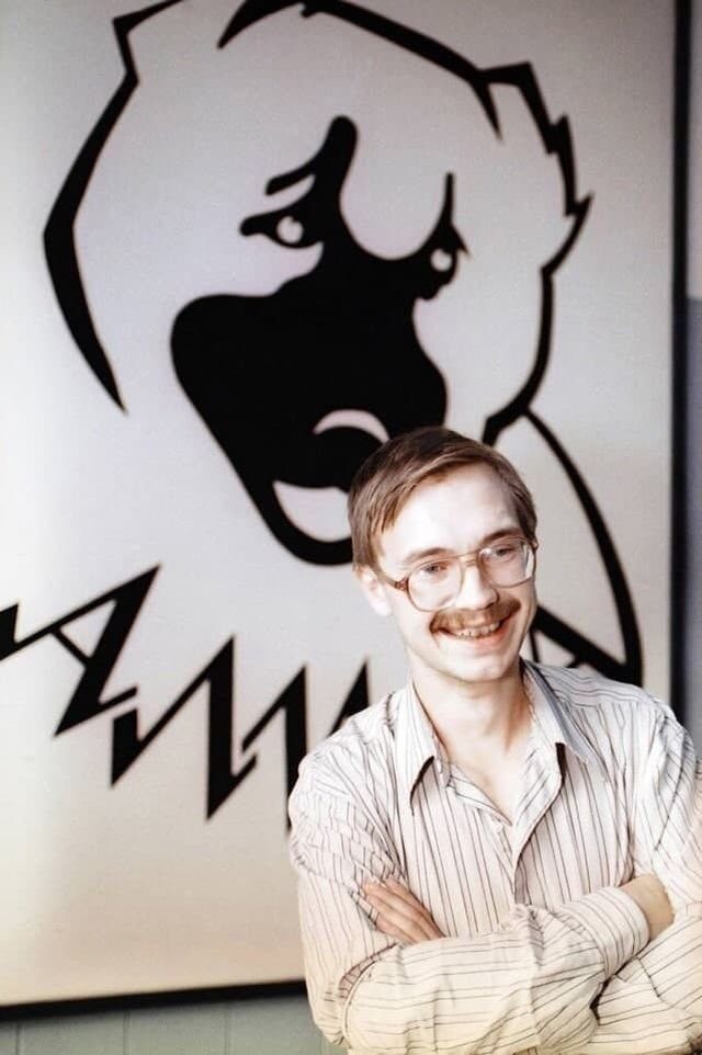 24-летний советский предприниматель Герман Стерлигов перед логотипом товарной биржи «Алиса», которую он назвал в честь своей любимой собаки. Москва, 4 августа 1991 год.