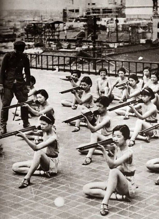 Японские школьницы, позируют для съемки на занятии по военной подготовке, где военный инструктор преподает им умение держать оружие правильно. 1930-е годы