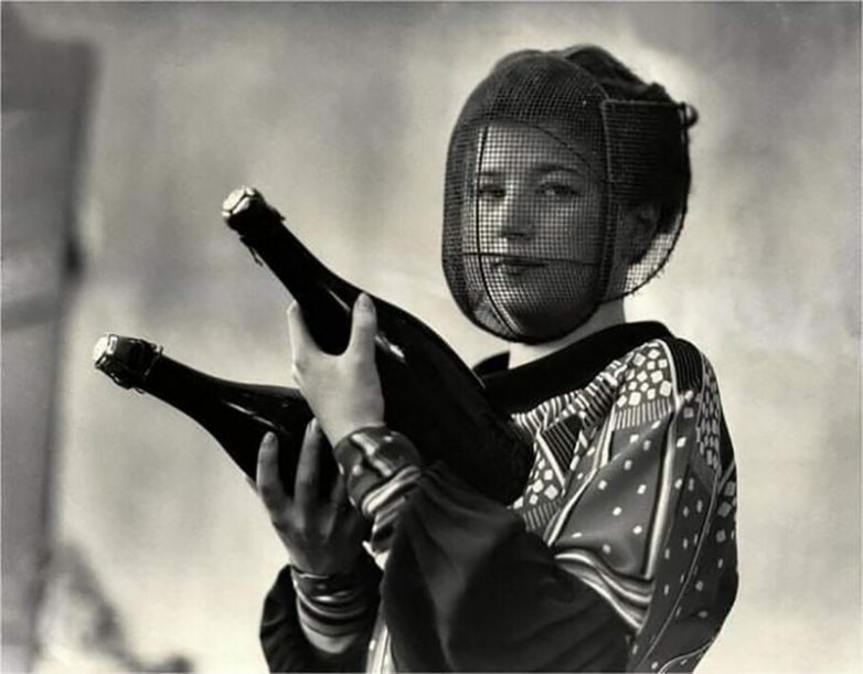 Проверяльщица сохранности бутылок шампанского в защитной маске. Франция, 1916 год