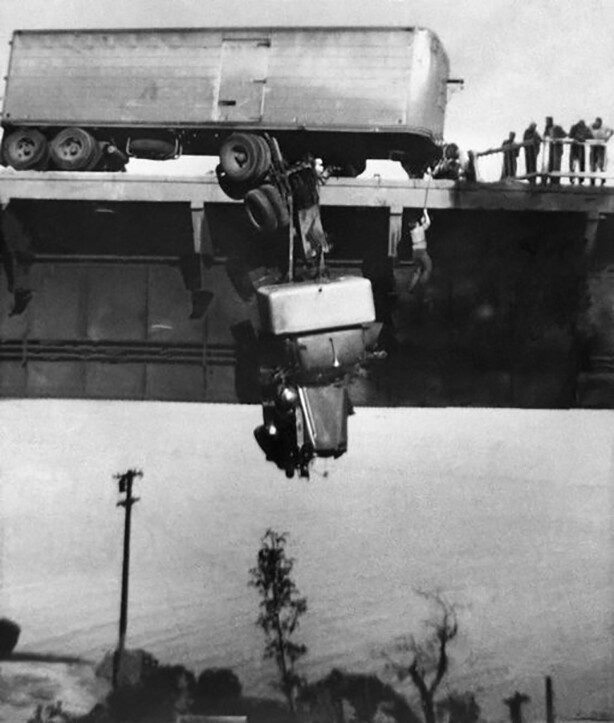 На фото Пол Оверби, один из двух водителей, застрявших в кабине грузовика. Его вытягивают на веревке на мосту Пит-Ривер через озеро Шаста недалеко от Реддинга, Калифорния, 3 мая 1953 года