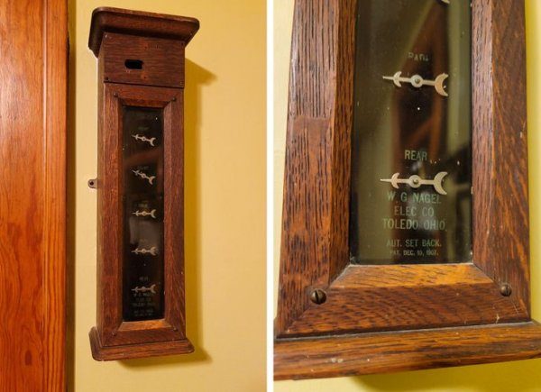 В доме начала 1900-х на третьем этаже висит деревянная шкатулка с 5 циферблатами