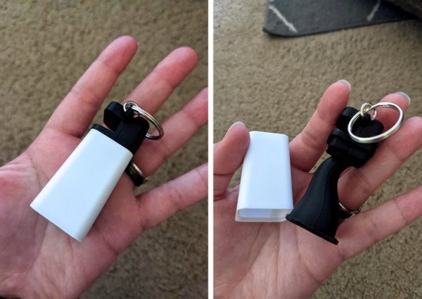 Брелок из 2 частей. Черная — резиновая, твердая и странной формы. Белая часть сделана из пластика