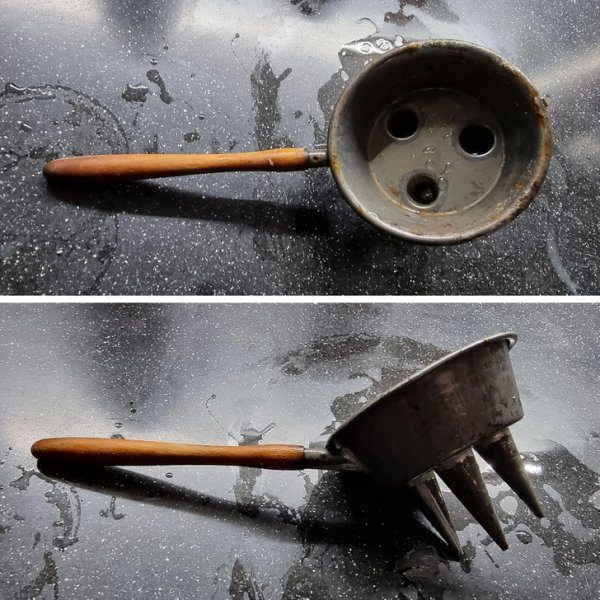 Кухонный девайс с деревянной ручкой, прикрепленной к круглой металлической чаше, у которой 3 шипа с отверстиями внутри