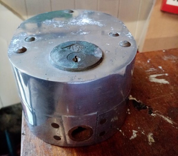 Странный металлический контейнер с замком, на котором выбито слово Nelson, и отверстием спереди. Сзади есть циферблат без единиц измерения, показывающий чуть меньше 22