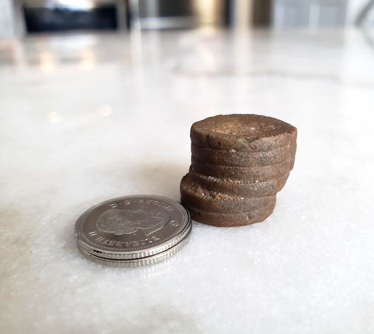 Вопрос: «Старые сплавленные монеты или фишки для покера? Эта странная стопка монет досталась мне в наследство от моего прадеда. Структура напоминает кварц, вся стопка весит 8 граммов, каждая монета имеет диаметр примерно десятицентовой монеты, но вдвое толще»
