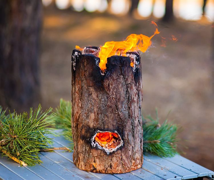 Шведский факел изготавливается путем продольного разрезания верхушки бревна на несколько частей практически до основания, затем внутрь заливают немного горючей жидкости, дают ей впитаться, после чего поджигают. В варианте, представленном на фото, даже предусмотрен воздуховод.