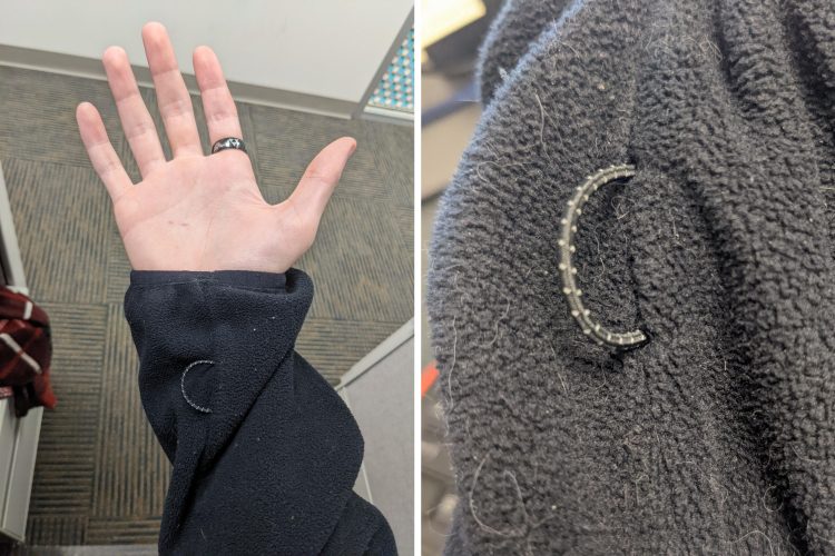 Ответ: «Эта флисовая кофта — часть куртки, которая надевается поверх неё. Петли кофты крепятся к рукавам куртки изнутри, чтобы флисовые рукава не вытаскивались из куртки, когда вы её снимаете».