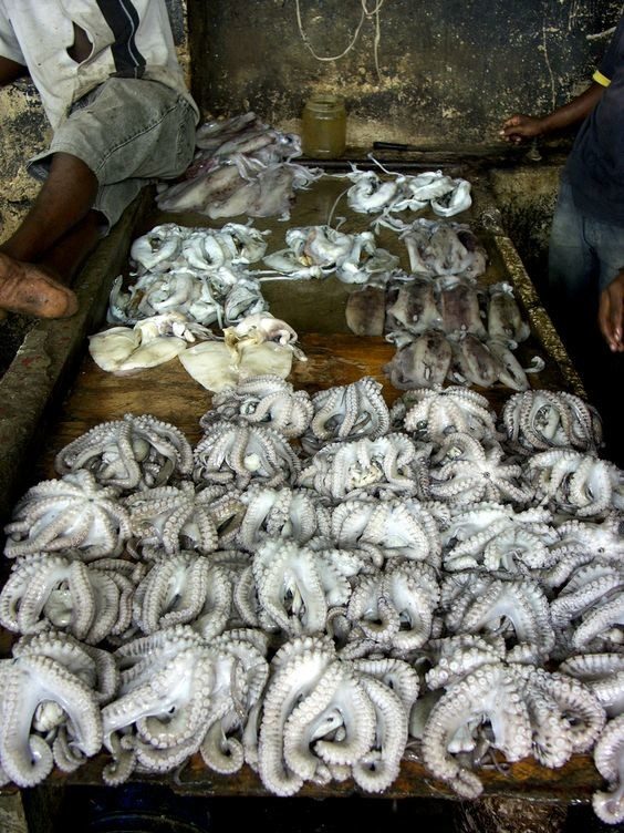 Кулинарный рынок Африки это все что бегает, шевелится и растет. Здесь могут быть обезьяны, мелкие антилопы, лесные свиньи, водяные крысы, летучие мыши. Пойманных крокодилов и крупных сомов привозят живыми, и на глазах покупателей разрубают мачете, жарят личинок и варят улиток.